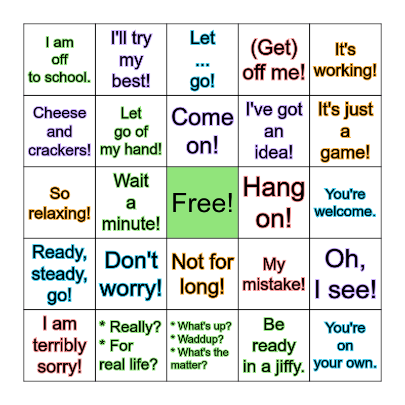 This bingo card has a free space and 29 words: I am terribly sorry!, Lovely, Wait a minute!, Never mind!, I am off to school., Let ... go!, Let go of my hand!, Don't worry!, Hang on!, * Really? * For real life?, You're welcome., You're on your own., * What's up? * Waddup? * What's the matter?, Be ready in a jiffy., It's just a game!, I've got my hands full., Not for long!, Ready, steady, go!, It's working!, So relaxing!, My mistake!, What should I do?, I've got an idea!, Cheese and crackers!, (Get) off me!, I'll try my best!, Oh, I see!, Come on! and It's my fault!.