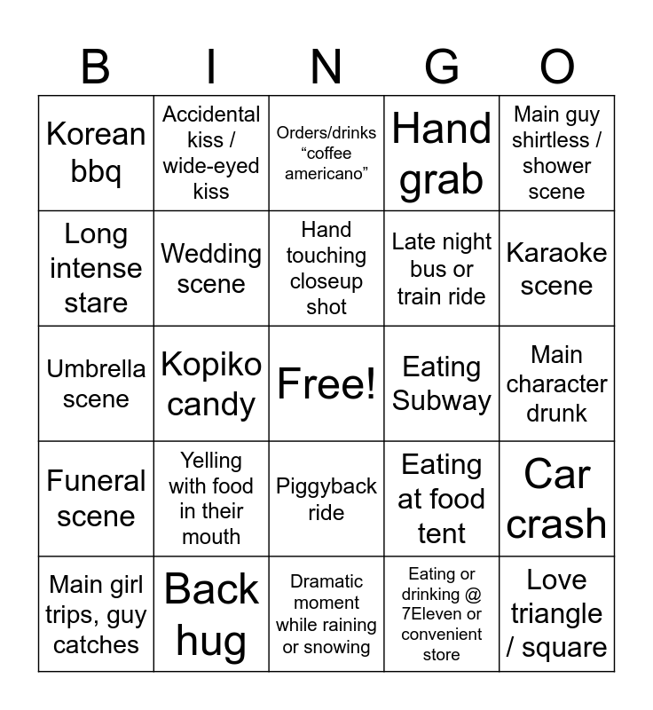 This bingo card has a free space and 34 words: Eating ramen, Eating or drinking @ 7Eleven or convenient store, Hair change during flash back/forward, Main lead gets jealous, Funeral scene, Wedding scene, Main guy shirtless / shower scene, Main girl trips, guy catches, Accidental kiss / wide-eyed kiss, Speaks English, Hand touching closeup shot, Orders/drinks “coffee americano”, Sits at the playground, Random foreigner, Eating Subway, Karaoke scene, Back hug, Umbrella scene, Yelling with food in their mouth, Eating at food tent, Piggyback ride, Drinking beer/soju, Korean bbq, Main character drunk, Dramatic moment while raining or snowing, Love triangle / square, Hand grab, Hangout at rooftop, Late night bus or train ride, Long intense stare, Elevator scene, Kopiko candy, Car crash and Sus guy wearing a black hoodie.