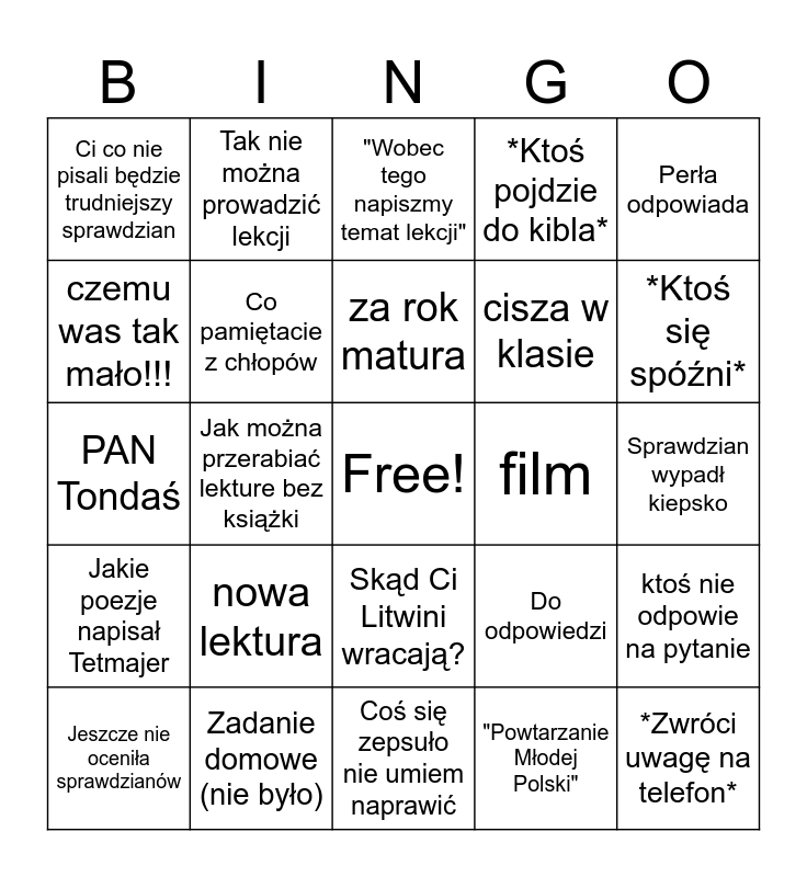 This bingo card has a free space and 24 words: nowa lektura, Zadanie domowe (nie było), za rok matura, Jeszcze nie oceniła sprawdzianów, Perła odpowiada, Ci co nie pisali będzie trudniejszy sprawdzian, czemu was tak mało!!!, Tak nie można prowadzić lekcji, film, Skąd Ci Litwini wracają?, cisza w klasie, PAN Tondaś, Do odpowiedzi, ktoś nie odpowie na pytanie, Co pamiętacie z chłopów, "Powtarzanie Młodej Polski", Sprawdzian wypadł kiepsko, "Wobec tego napiszmy temat lekcji", *Ktoś się spóźni*, Jak można przerabiać lekture bez książki, *Zwróci uwagę na telefon*, Jakie poezje napisał Tetmajer, *Ktoś pojdzie do kibla* and Coś się zepsuło nie umiem naprawić.