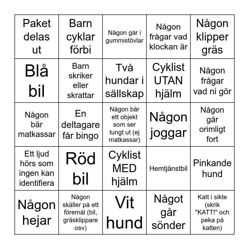 This bingo card has 25 words: Röd bil, Vit hund, Två hundar i sällskap, Någon hejar, Någon klipper gräs, Paket delas ut, Blå bil, Barn cyklar förbi, Någon joggar, Cyklist MED hjälm, Cyklist UTAN hjälm, Någon bär matkassar, Hemtjänstbil, Pinkande hund, Barn skriker eller skrattar, Katt i sikte (skrik "KATT!" och peka på katten), Någon går orimligt fort, Någon går i gummistövlar, Någon frågar vad ni gör, En deltagare får bingo, Någon bär ett objekt som ser tungt ut (ej matkassar), Någon skäller på ett föremål (bil, gräsklippare osv), Ett ljud hörs som ingen kan identifiera, Någon frågar vad klockan är and Något går sönder.