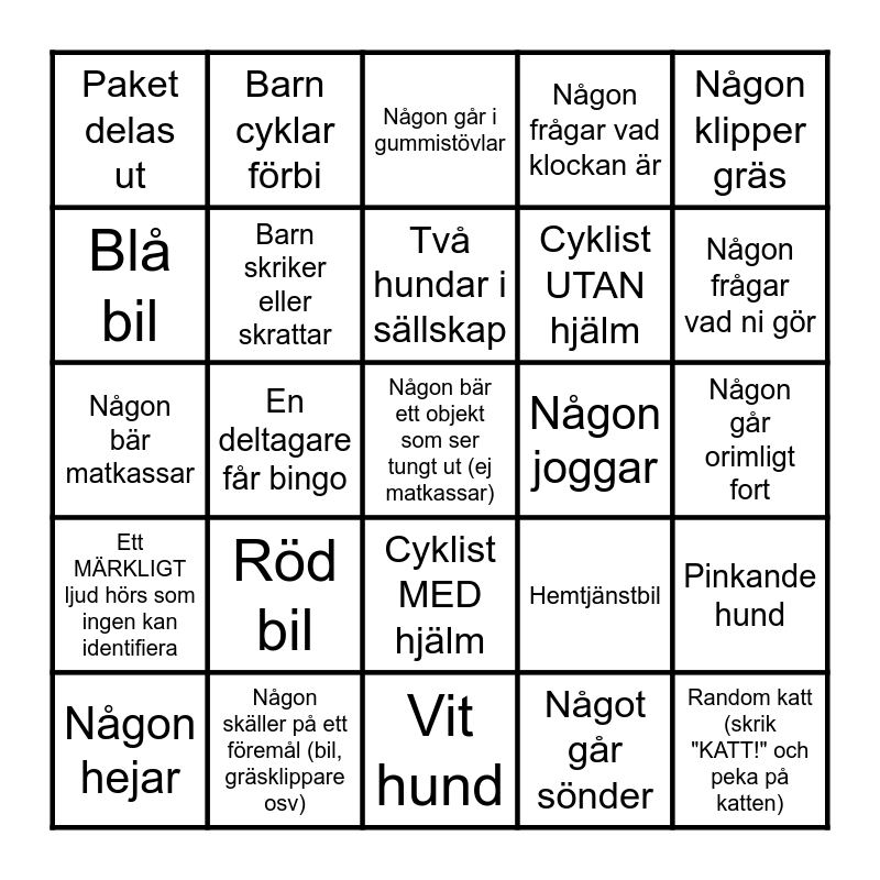 This bingo card has 25 words: Röd bil, Vit hund, Två hundar i sällskap, Någon hejar, Någon klipper gräs, Paket delas ut, Blå bil, Barn cyklar förbi, Någon joggar, Cyklist MED hjälm, Cyklist UTAN hjälm, Någon bär matkassar, Hemtjänstbil, Pinkande hund, Barn skriker eller skrattar, Random katt (skrik "KATT!" och peka på katten), Någon går orimligt fort, Någon går i gummistövlar, Någon frågar vad ni gör, En deltagare får bingo, Någon bär ett objekt som ser tungt ut (ej matkassar), Någon skäller på ett föremål (bil, gräsklippare osv), Ett MÄRKLIGT ljud hörs som ingen kan identifiera, Någon frågar vad klockan är and Något går sönder.