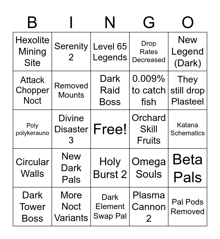This bingo card has a free space and 24 words: New Dark Pals, More Noct Variants, Dark Raid Boss, Dark Tower Boss, New Legend (Dark), Hexolite Mining Site, Attack Chopper Noct, Serenity 2, Orchard Skill Fruits, Holy Burst 2, 0.009% to catch fish, Poly polykerauno, Omega Souls, Beta Pals, Removed Mounts, Plasma Cannon 2, Katana Schematics, Level 65 Legends, They still drop Plasteel, Divine Disaster 3, Pal Pods Removed, Circular Walls, Drop Rates Decreased and Dark Element Swap Pal.