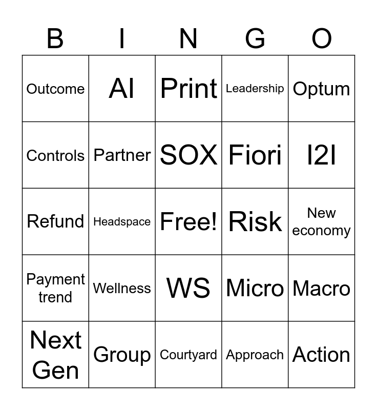 This bingo card has a free space and 50 words: Strategy, Action, Credit & Collection, Courtyard, Wellness, Cybersecurity, AI, Future of Work, Controls, Ownership, Partner, Leadership, Macro, Micro, Dynamic, Success, SOX, Risk, Phishing, Optum, Headspace, Approach, Outcome, Fiori, Dispute, Allocation, I2I, Personal Systems, Print, WS, Stakeholder, Finance Day, Courtyard, Presentation, Group, Controlership, Payroll, One HP, Readiness, New economy, Channel, G3D, Direct, GT1, Next Gen, Refund, Audit, Onboarding, Payment trend and Escalation.