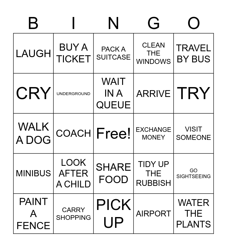 This bingo card has a free space and 32 words: AIRPORT, CABLE CAR, COACH, FERRY, MINIBUS, UNDERGROUND, TRAVEL BY BUS, GO SIGHTSEEING, BUY A TICKET, GO ON A TOUR, WAIT IN A QUEUE, PACK A SUITCASE, STAY IN A HOTEL, TAKE A TAXI, EXCHANGE MONEY, READ A GUIDEBOOK, PAINT A FENCE, WALK A DOG, SHARE FOOD, LOOK AFTER A CHILD, TIDY UP THE RUBBISH, OFFER SOMEONE YOUR SEAT, VISIT SOMEONE, CARRY SHOPPING, WATER THE PLANTS, CLEAN THE WINDOWS, ARRIVE, CRY, LAUGH, PICK UP, SMILE and TRY.
