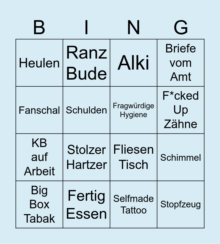 This bingo card has 16 words: Fertig Essen, Schimmel, Alki, Heulen, KB auf Arbeit, Ranz Bude, Fliesen Tisch, Selfmade Tattoo, Fanschal, Schulden, Big Box Tabak, Briefe vom Amt, Stolzer Hartzer, F*cked Up Zähne, Fragwürdige Hygiene and Stopfzeug.
