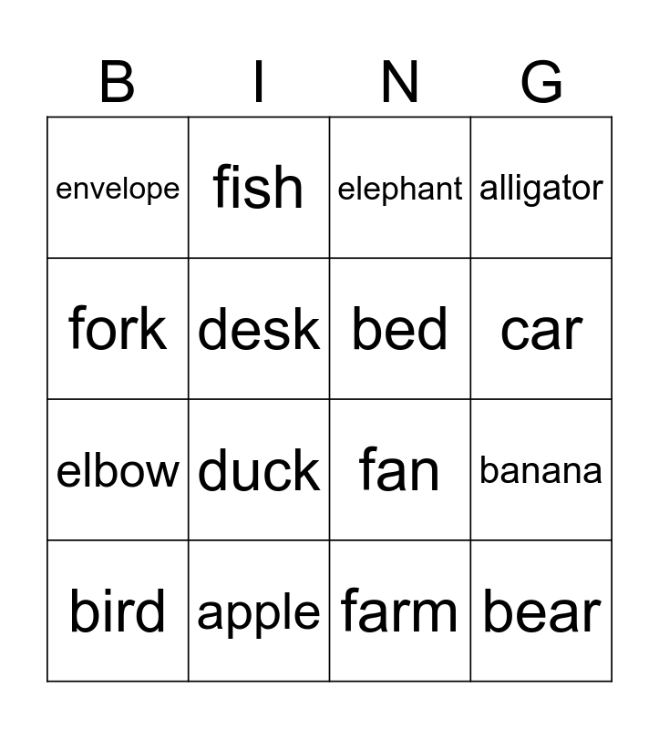 This bingo card has 16 words: apple, banana, elephant, envelope, elbow, fish, fan, farm, fork, desk, bird, alligator, duck, car, bed and bear.