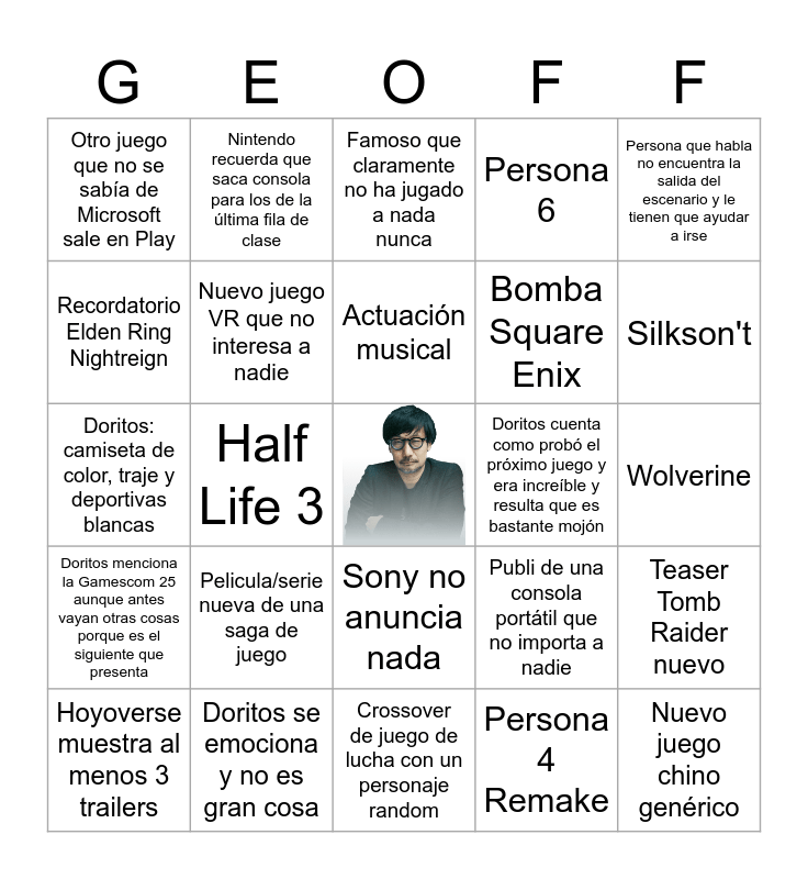 This bingo card has a free space and 24 words: Pelicula/serie nueva de una saga de juego, Doritos se emociona y no es gran cosa, Actuación musical, Hoyoverse muestra al menos 3 trailers, Persona que habla no encuentra la salida del escenario y le tienen que ayudar a irse, Otro juego que no se sabía de Microsoft sale en Play, Recordatorio Elden Ring Nightreign, Nintendo recuerda que saca consola para los de la última fila de clase, Doritos cuenta como probó el próximo juego y era increíble y resulta que es bastante mojón, Sony no anuncia nada, Bomba Square Enix, Doritos: camiseta de color, traje y deportivas blancas, Publi de una consola portátil que no importa a nadie, Teaser Tomb Raider nuevo, Nuevo juego VR que no interesa a nadie, Persona 4 Remake, Wolverine, Famoso que claramente no ha jugado a nada nunca, Silkson't, Half Life 3, Nuevo juego chino genérico, Doritos menciona la Gamescom 25 aunque antes vayan otras cosas porque es el siguiente que presenta, Persona 6 and Crossover de juego de lucha con un personaje random.