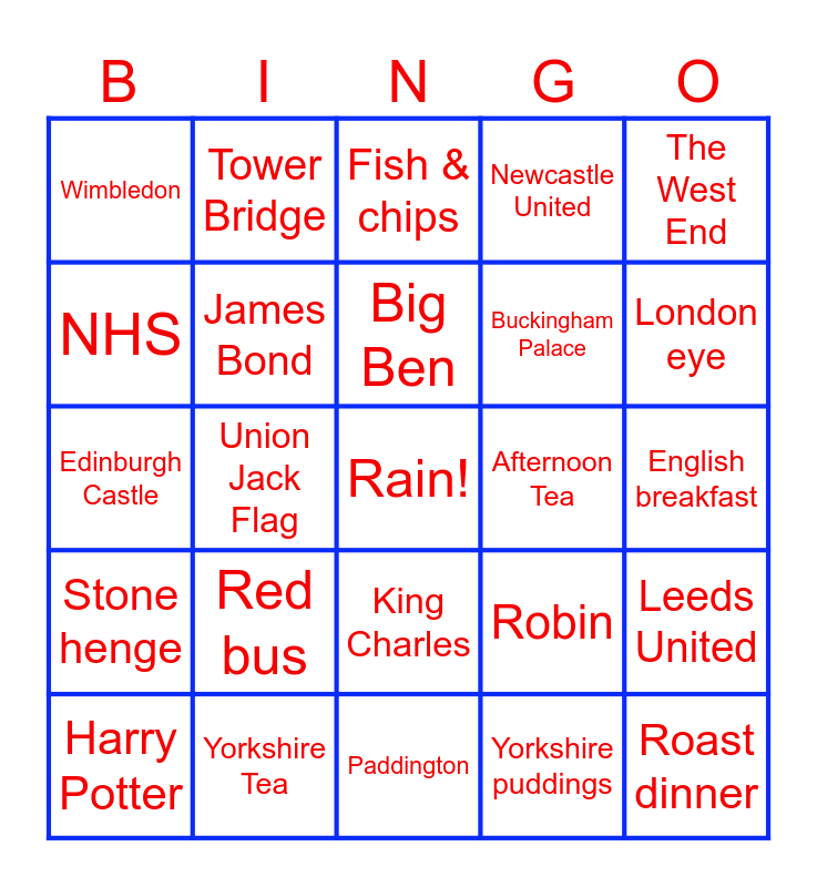 This bingo card has a free space and 24 words: Red bus, Yorkshire Tea, Big Ben, Harry Potter, The West End, Wimbledon, NHS, Tower Bridge, Afternoon Tea, King Charles, Buckingham Palace, Edinburgh Castle, Robin, Leeds United, James Bond, Yorkshire puddings, English breakfast, Fish & chips, London eye, Union Jack Flag, Roast dinner, Stone henge, Newcastle United and Paddington.