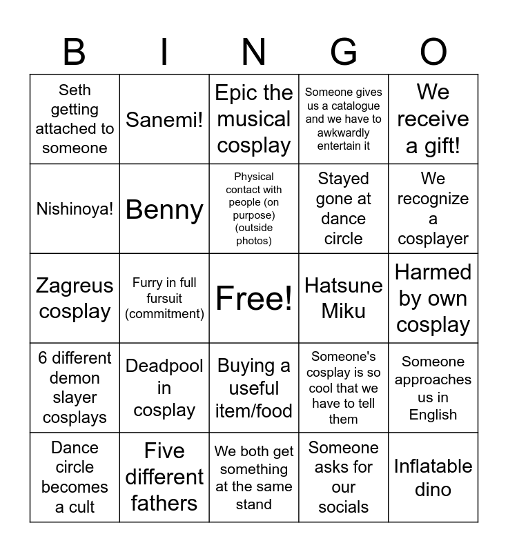 This bingo card has a free space and 24 words: Deadpool in cosplay, Five different fathers, Physical contact with people (on purpose) (outside photos), Dance circle becomes a cult, We receive a gift!, Seth getting attached to someone, Nishinoya!, Sanemi!, Hatsune Miku, Buying a useful item/food, Stayed gone at dance circle, Zagreus cosplay, Someone's cosplay is so cool that we have to tell them, Someone approaches us in English, Benny, Someone asks for our socials, Harmed by own cosplay, Epic the musical cosplay, We recognize a cosplayer, Furry in full fursuit (commitment), Inflatable dino, 6 different demon slayer cosplays, Someone gives us a catalogue and we have to awkwardly entertain it and We both get something at the same stand.