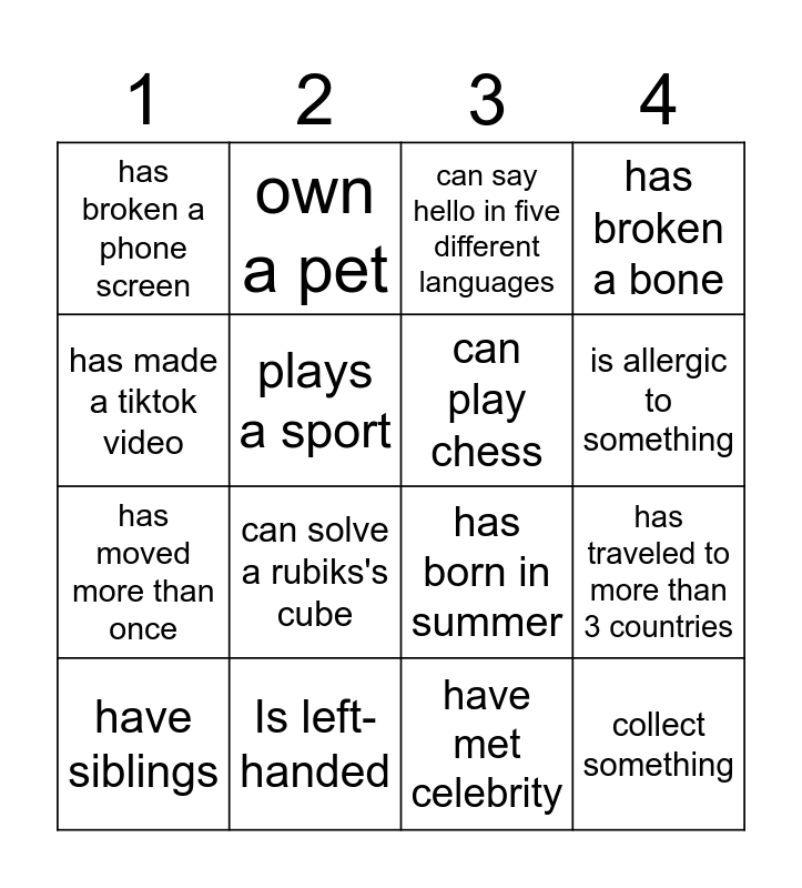 This bingo card has 16 words: Is left-handed, has traveled to more than 3 countries, can say hello in five different languages, has broken a phone screen, has moved more than once, own a pet, has born in summer, have met celebrity, has made a tiktok video, plays a sport, have siblings, has broken a bone, can solve a rubiks's cube, is allergic to something, can play chess and collect something.