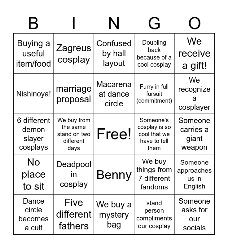 This bingo card has a free space and 24 words: Deadpool in cosplay, Five different fathers, Macarena at dance circle, Dance circle becomes a cult, We receive a gift!, Buying a useful item/food, Nishinoya!, Zagreus cosplay, Someone's cosplay is so cool that we have to tell them, Benny, Furry in full fursuit (commitment), 6 different demon slayer cosplays, We buy things from 7 different fandoms, Someone approaches us in English, marriage proposal, stand person compliments our cosplay, Someone carries a giant weapon, Confused by hall layout, We recognize a cosplayer, We buy from the same stand on two different days, Someone asks for our socials, No place to sit, Doubling back because of a cool cosplay and We buy a mystery bag.