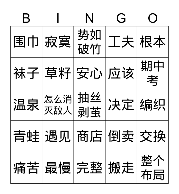 This bingo card has a free space and 24 words: 遇见, 最慢, 安心, 痛苦, 根本, 围巾, 袜子, 寂寞, 决定, 商店, 应该, 温泉, 倒卖, 交换, 草籽, 搬走, 编织, 势如破竹, 期中考, 怎么消灭敌人, 整个布局, 青蛙, 工夫 and 完整.