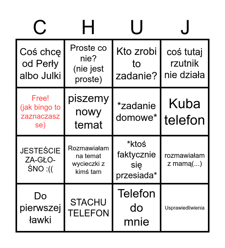 This bingo card has 16 words: STACHU TELEFON, rozmawiałam z mamą(...), Kto zrobi to zadanie?, Coś chcę od Perły albo Julki, JESTEŚCIE ZA-GŁO-ŚNO :((, Proste co nie? (nie jest proste), *ktoś faktycznie się przesiada*, Telefon do mnie, Free! (jak bingo to zaznaczasz se), piszemy nowy temat, Do pierwszej ławki, coś tutaj rzutnik nie działa, Rozmawiałam na temat wycieczki z kimś tam, Kuba telefon, *zadanie domowe* and Usprawiedliwienia.