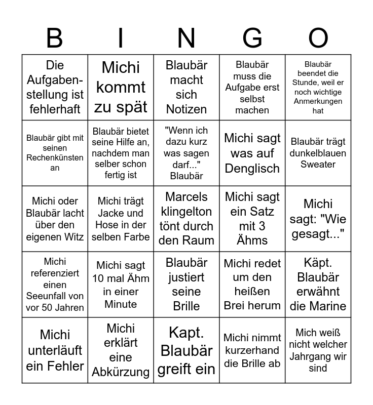 This bingo card has 25 words: Michi sagt 10 mal Ähm in einer Minute, Kapt. Blaubär greift ein, "Wenn ich dazu kurz was sagen darf..." Blaubär, Michi unterläuft ein Fehler, Blaubär beendet die Stunde, weil er noch wichtige Anmerkungen hat, Die Aufgaben-stellung ist fehlerhaft, Blaubär gibt mit seinen Rechenkünsten an, Michi kommt zu spät, Michi sagt ein Satz mit 3 Ähms, Blaubär justiert seine Brille, Michi sagt was auf Denglisch, Michi oder Blaubär lacht über den eigenen Witz, Michi redet um den heißen Brei herum, Käpt. Blaubär erwähnt die Marine, Blaubär bietet seine Hilfe an, nachdem man selber schon fertig ist, Mich weiß nicht welcher Jahrgang wir sind, Michi sagt: "Wie gesagt...", Blaubär macht sich Notizen, Blaubär trägt dunkelblauen Sweater, Michi trägt Jacke und Hose in der selben Farbe, Marcels klingelton tönt durch den Raum, Michi erklärt eine Abkürzung, Michi referenziert einen Seeunfall von vor 50 Jahren, Blaubär muss die Aufgabe erst selbst machen and Michi nimmt kurzerhand die Brille ab.