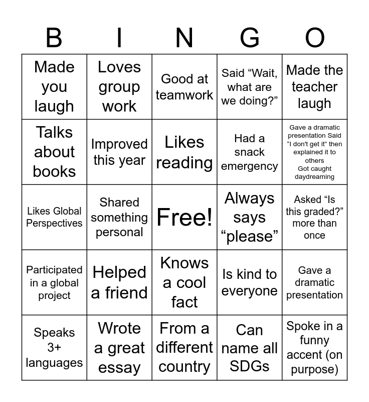This bingo card has a free space and 24 words: Speaks 3+ languages, Helped a friend, Likes reading, Can name all SDGs, Made the teacher laugh, Made you laugh, Loves group work, Good at teamwork, Always says “please”, Asked “Is this graded?” more than once, Likes Global Perspectives, Improved this year, Is kind to everyone, Gave a dramatic presentation, Talks about books, Wrote a great essay, From a different country, Said “Wait, what are we doing?”, Gave a dramatic presentation Said “I don't get it” then explained it to others Got caught daydreaming, Participated in a global project, Shared something personal, Knows a cool fact, Had a snack emergency and Spoke in a funny accent (on purpose).