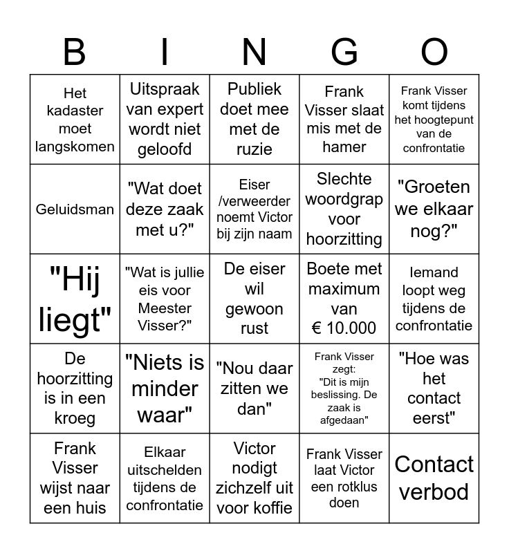 This bingo card has 25 words: "Niets is minder waar", Victor nodigt zichzelf uit voor koffie, Eiser /verweerder noemt Victor bij zijn naam, Frank Visser wijst naar een huis, Frank Visser komt tijdens het hoogtepunt van de confrontatie, Het kadaster moet langskomen, Geluidsman, Uitspraak van expert wordt niet geloofd, Boete met maximum van € 10.000, "Nou daar zitten we dan", Slechte woordgrap voor hoorzitting, "Hij liegt", Frank Visser zegt: "Dit is mijn beslissing. De zaak is afgedaan", "Hoe was het contact eerst", "Wat doet deze zaak met u?", Contact verbod, Iemand loopt weg tijdens de confrontatie, Publiek doet mee met de ruzie, "Groeten we elkaar nog?", "Wat is jullie eis voor Meester Visser?", De eiser wil gewoon rust, Elkaar uitschelden tijdens de confrontatie, De hoorzitting is in een kroeg, Frank Visser slaat mis met de hamer and Frank Visser laat Victor een rotklus doen.