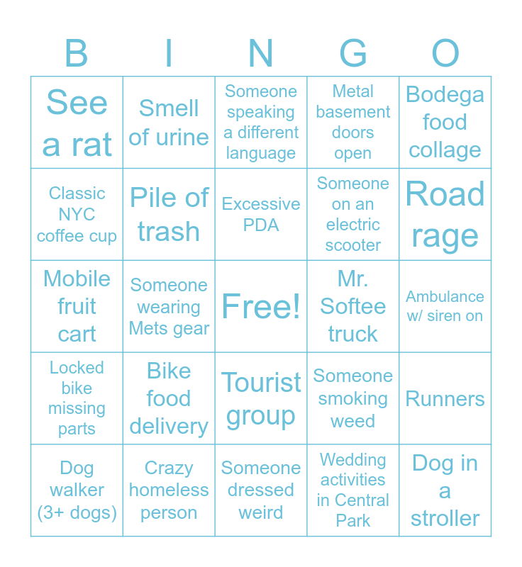 This bingo card has a free space and 24 words: Bike food delivery, Crazy homeless person, Excessive PDA, Dog walker (3+ dogs), Bodega food collage, See a rat, Classic NYC coffee cup, Smell of urine, Mr. Softee truck, Tourist group, Someone on an electric scooter, Mobile fruit cart, Someone smoking weed, Runners, Pile of trash, Wedding activities in Central Park, Ambulance w/ siren on, Someone speaking a different language, Road rage, Someone wearing Mets gear, Dog in a stroller, Locked bike missing parts, Metal basement doors open and Someone dressed weird.