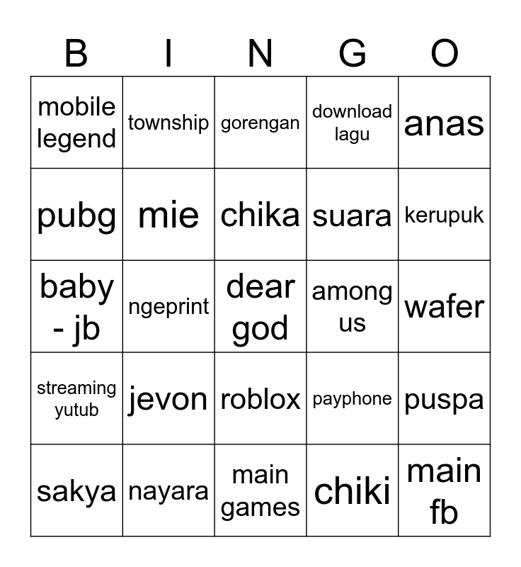 This bingo card has a free space and 24 words: jevon, nayara, chika, sakya, anas, mobile legend, pubg, township, among us, roblox, suara, baby - jb, payphone, puspa, mie, chiki, wafer, gorengan, kerupuk, ngeprint, main fb, streaming yutub, download lagu and main games.