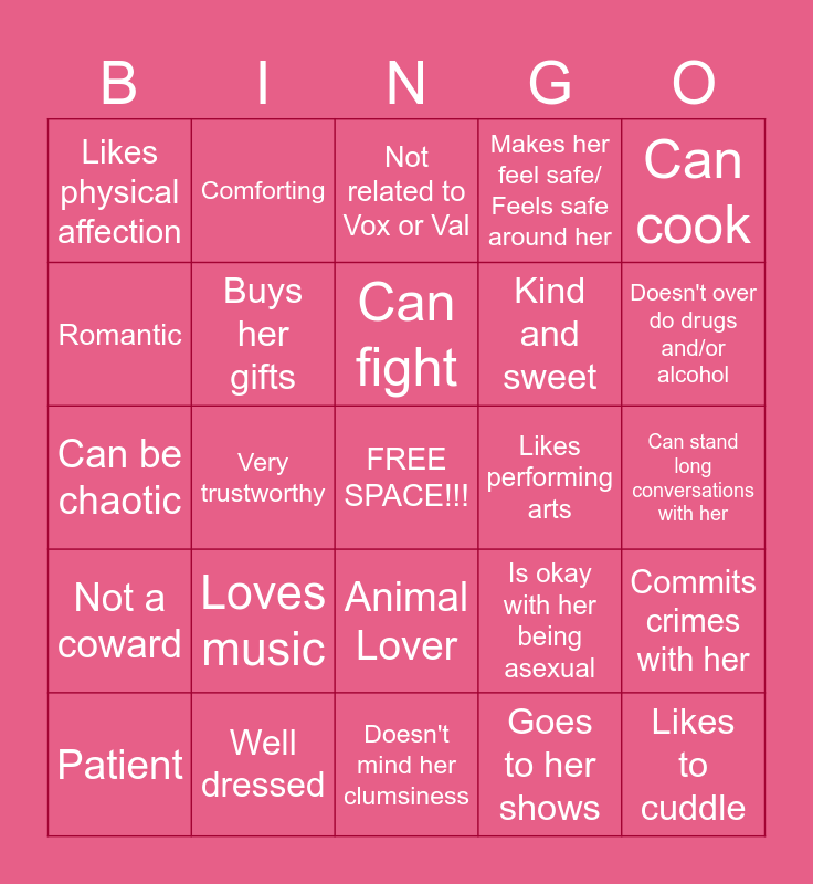 This bingo card has a free space and 24 words: Loves music, Well dressed, Can fight, Patient, Can cook, Likes physical affection, Romantic, Comforting, Likes performing arts, Animal Lover, Kind and sweet, Can be chaotic, Is okay with her being asexual, Commits crimes with her, Buys her gifts, Goes to her shows, Can stand long conversations with her, Not related to Vox or Val, Doesn't over do drugs and/or alcohol, Very trustworthy, Likes to cuddle, Not a coward, Makes her feel safe/ Feels safe around her and Doesn't mind her clumsiness.