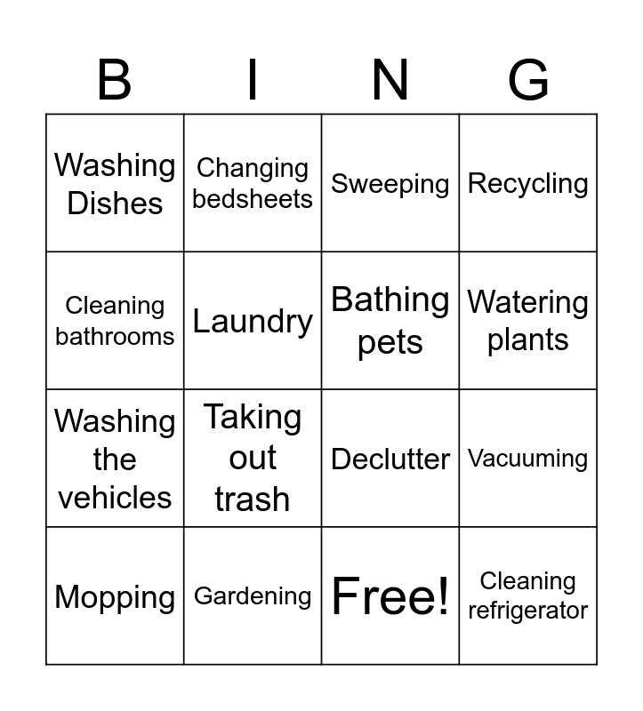 This bingo card has 17 words: Free!, Mopping, Sweeping, Washing Dishes, Taking out trash, Recycling, Vacuuming, Bathing pets, Watering plants, Laundry, Gardening, Declutter, Cleaning bathrooms, Changing bedsheets, Washing the vehicles, Wipe out windows and Cleaning refrigerator.