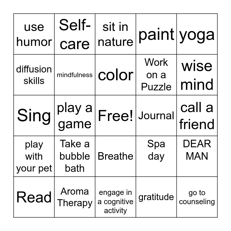 This bingo card has a free space and 24 words: Take a bubble bath, Aroma Therapy, color, Read, yoga, use humor, diffusion skills, Self-care, Journal, Breathe, Work on a Puzzle, Sing, Spa day, DEAR MAN, mindfulness, gratitude, call a friend, sit in nature, wise mind, play a game, go to counseling, play with your pet, paint and engage in a cognitive activity.