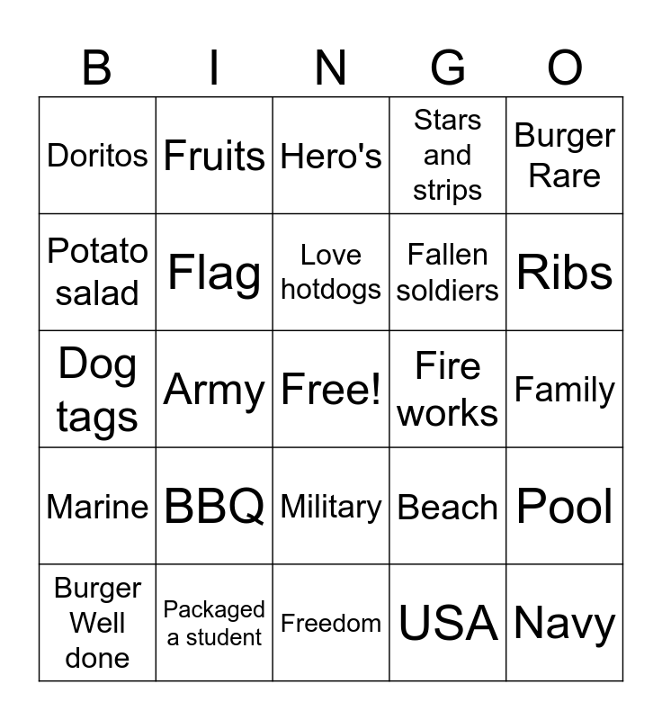 This bingo card has a free space and 24 words: BBQ, Packaged a student, Love hotdogs, Burger Well done, Burger Rare, Doritos, Potato salad, Fruits, Fire works, Military, Fallen soldiers, Dog tags, Beach, Pool, Flag, USA, Family, Hero's, Ribs, Army, Navy, Marine, Stars and strips and Freedom.