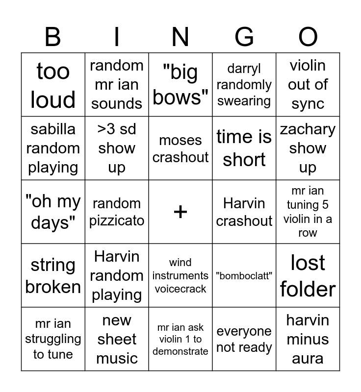 This bingo card has a free space and 24 words: Harvin random playing, new sheet music, moses crashout, mr ian struggling to tune, violin out of sync, too loud, sabilla random playing, random mr ian sounds, Harvin crashout, wind instruments voicecrack, time is short, "oh my days", "bomboclatt", lost folder, >3 sd show up, everyone not ready, mr ian tuning 5 violin in a row, "big bows", zachary show up, random pizzicato, harvin minus aura, string broken, darryl randomly swearing and mr ian ask violin 1 to demonstrate.