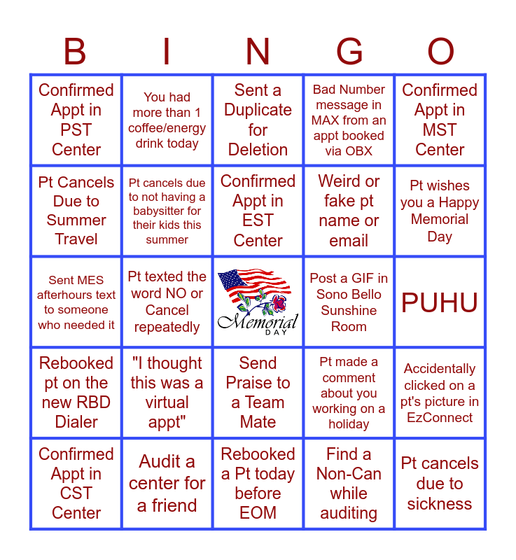 This bingo card has a free space and 24 words: "I thought this was a virtual appt", Audit a center for a friend, Confirmed Appt in EST Center, Confirmed Appt in CST Center, Confirmed Appt in MST Center, Confirmed Appt in PST Center, Pt Cancels Due to Summer Travel, You had more than 1 coffee/energy drink today, Post a GIF in Sono Bello Sunshine Room, Send Praise to a Team Mate, Weird or fake pt name or email, Sent MES afterhours text to someone who needed it, Pt made a comment about you working on a holiday, Accidentally clicked on a pt's picture in EzConnect, Pt cancels due to not having a babysitter for their kids this summer, Find a Non-Can while auditing, PUHU, Sent a Duplicate for Deletion, Pt wishes you a Happy Memorial Day, Pt texted the word NO or Cancel repeatedly, Pt cancels due to sickness, Rebooked pt on the new RBD Dialer, Bad Number message in MAX from an appt booked via OBX and Rebooked a Pt today before EOM.