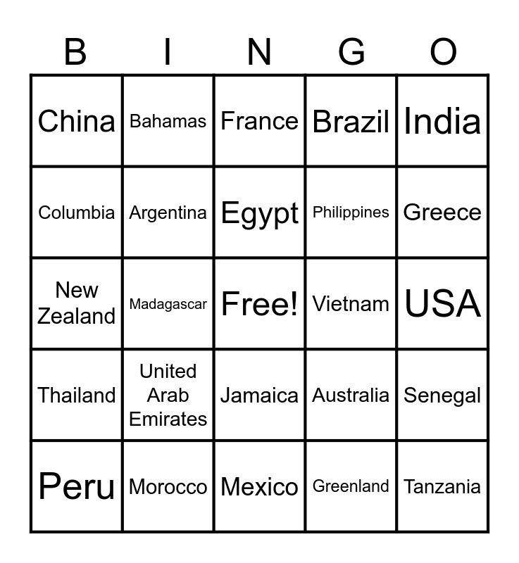 This bingo card has a free space and 34 words: Spain, Greenland, Canada, Turkey, Thailand, Argentina, India, Peru, Bahamas, Germany, Egypt, France, Italy, Japan, Vietnam, Greece, Morocco, New Zealand, United Arab Emirates, Australia, Jamaica, Kenya, China, USA, Mexico, Tanzania, Brazil, South Africa, Philippines, Columbia, Belgium, Madagascar, Senegal and Korea.
