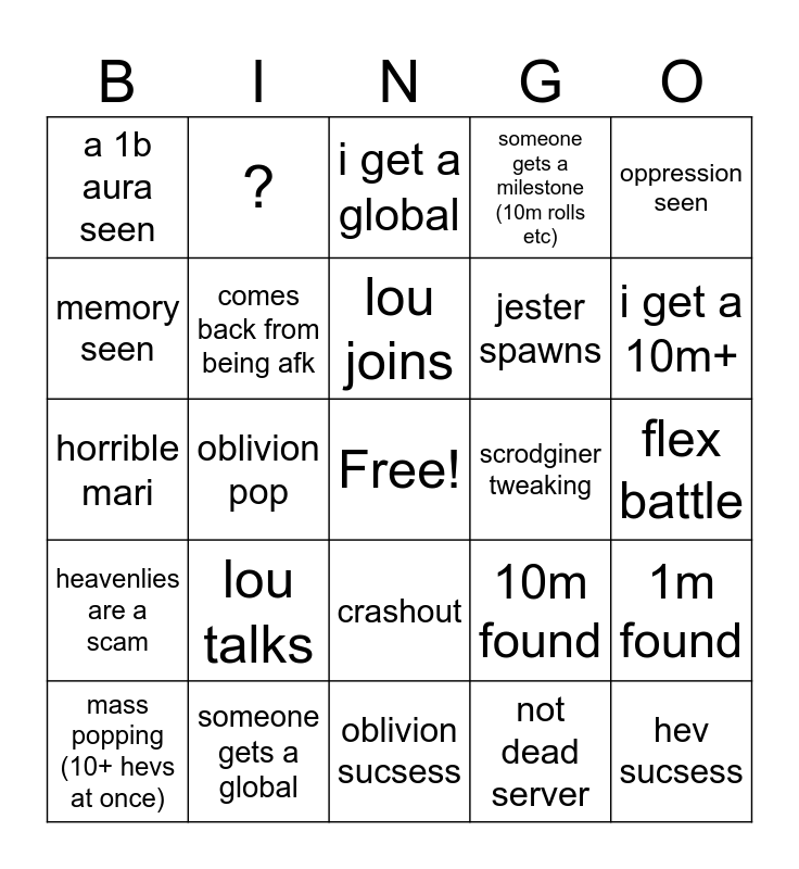 This bingo card has a free space and 24 words: lou talks, someone gets a global, lou joins, mass popping (10+ hevs at once), oppression seen, a 1b aura seen, memory seen, ?, scrodginer tweaking, crashout, jester spawns, horrible mari, 10m found, 1m found, comes back from being afk, not dead server, flex battle, i get a global, i get a 10m+, oblivion pop, hev sucsess, heavenlies are a scam, someone gets a milestone (10m rolls etc) and oblivion sucsess.