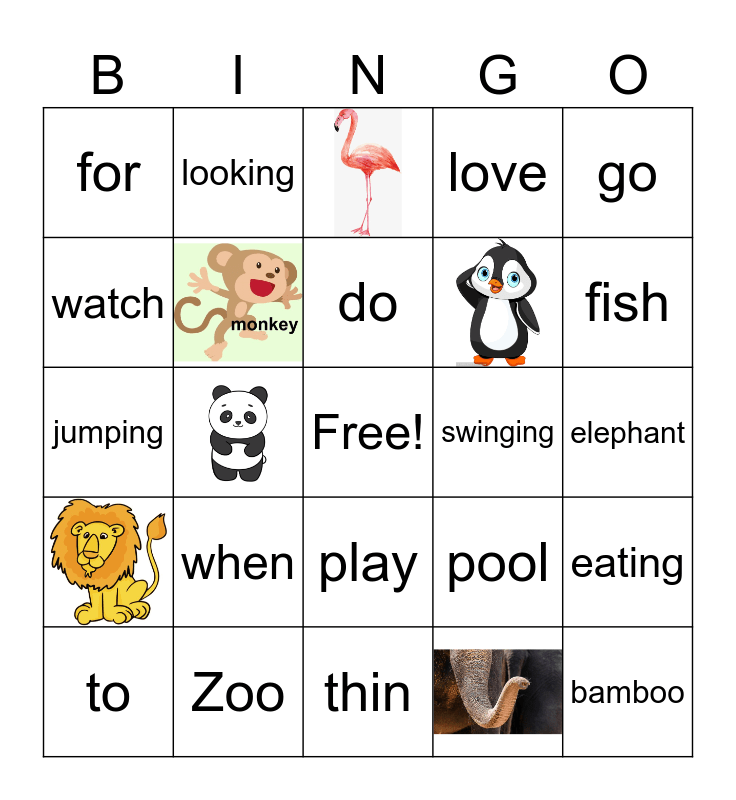 This bingo card has 6 images, a free space and 18 words: when, Zoo, do, to, go, for, watch, looking, swinging, play, jumping, pool, eating, elephant, fish, bamboo, love and thin.
