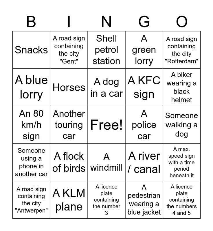This bingo card has a free space and 33 words: A yellow car, A "Welcome to..." / Country sign, Another touring car, Cows, Someone using a phone in another car, Horses, A road sign containing the city "Rotterdam", A road sign containing the city "Antwerpen", A road sign containing the city "Gent", A car with a UK licence plate, A dog in a car, Shell petrol station, A car standing still on the hard shoulder (vluchtstrook), A sports car, A police car, A biker wearing a black helmet, A KLM plane, An 80 km/h sign, A flock of birds, A river / canal, A windmill, Solar panels, Snacks, Someone walking a dog, A licence plate containing the number 3, A licence plate containing the numbers 4 and 5, A green lorry, A KFC sign, A blue lorry, A max. speed sign with a time period beneath it, A Mac Donalds sign, A pedestrian wearing a blue jacket and A licence plate containing the letters N and G.