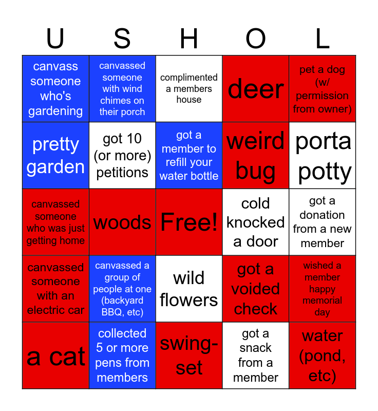 This bingo card has a free space and 24 words: canvassed a group of people at one (backyard BBQ, etc), collected 5 or more pens from members, got a member to refill your water bottle, a cat, pet a dog (w/ permission from owner), canvass someone who's gardening, pretty garden, canvassed someone with wind chimes on their porch, cold knocked a door, wild flowers, weird bug, canvassed someone who was just getting home, got a voided check, wished a member happy memorial day, got 10 (or more) petitions, got a snack from a member, got a donation from a new member, complimented a members house, porta potty, woods, water (pond, etc), canvassed someone with an electric car, deer and swing-set.