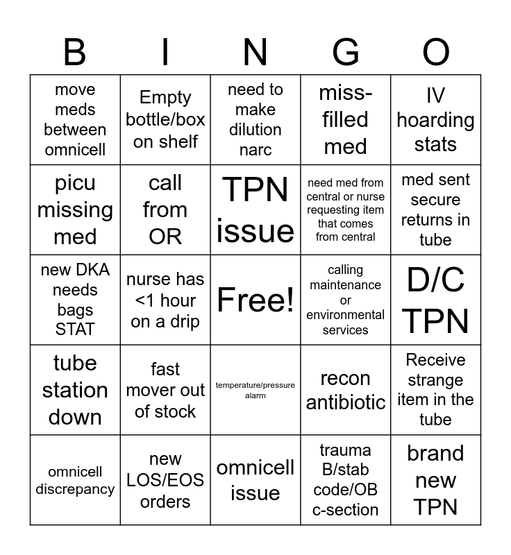 This bingo card has a free space and 63 words: survanta, Pharmacist dispenses something to IV room that should be UD, Nurse asks how long to run drug over, Receive strange item in the tube, compatibility question, can I crush/does this go in a gtube, Empty bottle/box on shelf, Med message for missing cartfill item, TPN issue, stat alteplase, temperature/pressure alarm, neprho changes crrt or PD order, D/C TPN, IV hoarding stats, code response needed, picu missing med, nurse has <1 hour on a drip, move meds between omnicell, med request for order put in <10 min ago, need med from central or nurse requesting item that comes from central, fast mover out of stock, tube station down, miss-filled med, page on call, request for med to be tubed on do not tube list, retail (break-in, counseling, nurse calling wrong #), call to borrow a med, med message requesting drug in omnicell, need new tackle box, expired compound, smog compound, premix station with >5 to prep, page or call NNP, rec from a consult service, med sent secure returns in tube, omnicell discrepancy, med not scanning (doseedge or nurse call), trauma B/stab code/OB c-section, expired med (not compound), call from OR, new DKA needs bags STAT, calling maintenance or environmental services, pharm-is ticket, doseedge bypass, brand new TPN, new LOS/EOS orders, request for vaccine, recon antibiotic, ID home med, status board clear, request for on call electrolytes, omnicell issue, med message requesting med scanned into med bin, phone call from MD needing dose recommendation, critical dose warning override, need to make dilution narc, med stored improperly, nurse calls and asks for med to be approved, epic queue clear, Door bell to pharmacy, IV room calls out for stock, DE rework and need to waste for a narc.