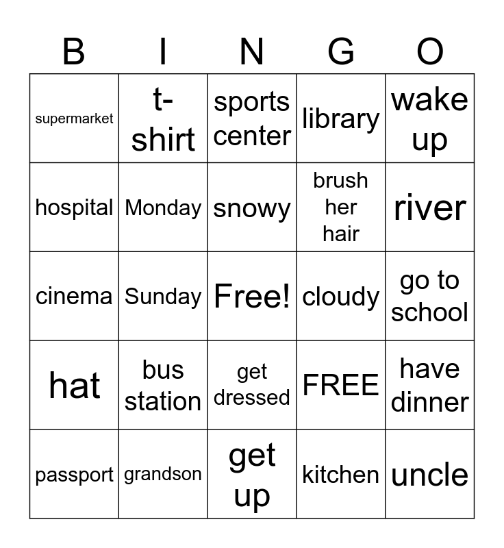 This bingo card has a free space and 25 words: bus station, get up, snowy, passport, wake up, supermarket, hospital, t-shirt, cloudy, get dressed, brush her hair, cinema, FREE, have dinner, Monday, family, go to school, sports center, river, Sunday, uncle, grandson, hat, library and kitchen.