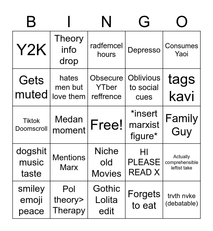 This bingo card has a free space and 24 words: Mentions Marx, Pol theory> Therapy, Obsecure YTber reffrence, smiley emoji peace, Consumes Yaoi, Y2K, Gets muted, Theory info drop, *insert marxist figure*, Niche old Movies, Oblivious to social cues, Tiktok Doomscroll, HI PLEASE READ X, Actually comprehensible leftist take, hates men but love them, Forgets to eat, Family Guy, radfemcel hours, tags kavi, Medan moment, trvth nvke (debatable), dogshit music taste, Depresso and Gothic Lolita edit.