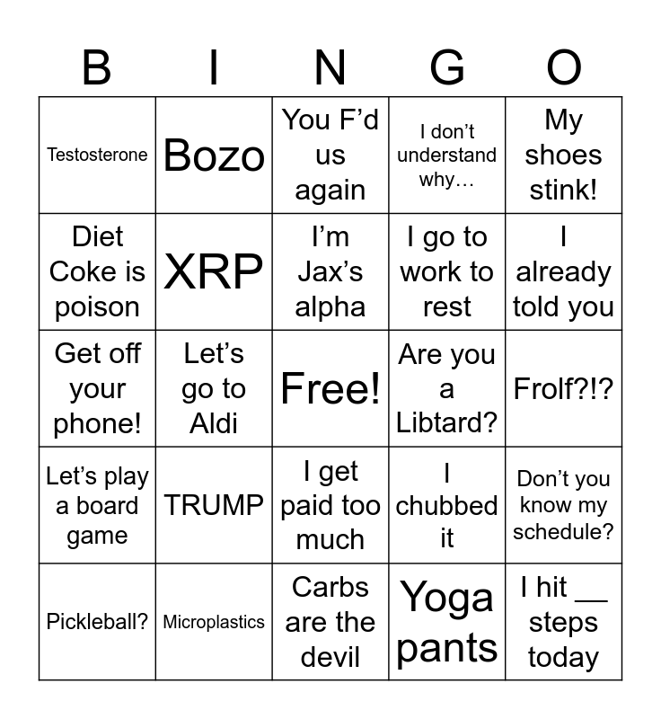 This bingo card has a free space and 24 words: TRUMP, Microplastics, I’m Jax’s alpha, Pickleball?, My shoes stink!, Testosterone, Diet Coke is poison, Bozo, Are you a Libtard?, I get paid too much, I go to work to rest, Get off your phone!, I chubbed it, Don’t you know my schedule?, XRP, Yoga pants, Frolf?!?, You F’d us again, I already told you, Let’s go to Aldi, I hit __ steps today, Let’s play a board game, I don’t understand why… and Carbs are the devil.