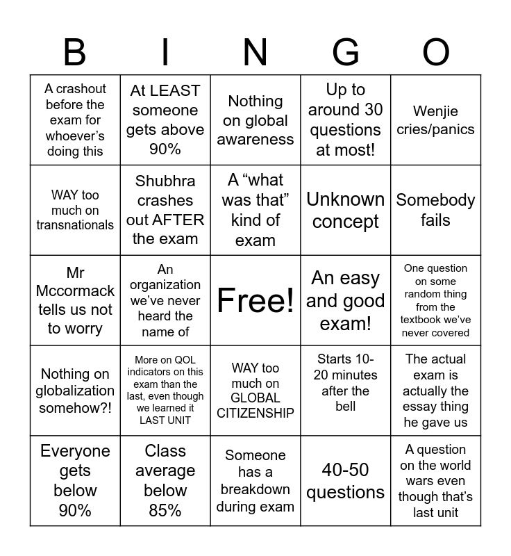 This bingo card has a free space and 24 words: More on QOL indicators on this exam than the last, even though we learned it LAST UNIT, Class average below 85%, A “what was that” kind of exam, Everyone gets below 90%, Wenjie cries/panics, A crashout before the exam for whoever’s doing this, WAY too much on transnationals, At LEAST someone gets above 90%, An easy and good exam!, WAY too much on GLOBAL CITIZENSHIP, Unknown concept, Mr Mccormack tells us not to worry, Starts 10-20 minutes after the bell, The actual exam is actually the essay thing he gave us, Shubhra crashes out AFTER the exam, 40-50 questions, One question on some random thing from the textbook we’ve never covered, Nothing on global awareness, Somebody fails, An organization we’ve never heard the name of, A question on the world wars even though that’s last unit, Nothing on globalization somehow?!, Up to around 30 questions at most! and Someone has a breakdown during exam.