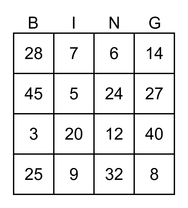 This bingo card has 27 words: 1, 2, 3, 4, 5, 6, 7, 8, 9, 10, 12, 14, 16, 18, 20, 21, 24, 27, 30, 28, 32, 36, 40, 25, 35, 45 and 50.