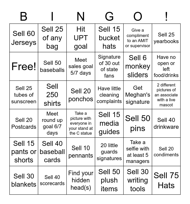 This bingo card has 36 words: Sell 20 Postcards, Meet round up goal 6/7 days, Find your hidden head(s), Signature of 30 out of state fans, Get Meghan's signature, 2 different pictures of an associate with a live mascot, Sell 60 Jerseys, Sell 40 scorecards, Hit UPT goal, 20 little guards signatures, Sell 6 monkey sliders, Sell 25 yearbooks, Sell 15 pants or shorts, Sell 250 shirts, Meet sales goal 5/7 days, Sell 15 bucket hats, Take a selfie with at least 5 managers, Sell 40 drinkware, Free!, Sell 50 baseballs, Take a picture with everyone in your stand at the C statue, Sell 15 media guides, Sell 50 pins, Sell 20 condiments, Sell 25 tubes of sunscreen, Sell 25 of any bag, Sell 20 ponchos, Sell 50 plush items, Give a compliment to an AMIT or supervisor, Have no open or left food/drinks, Sell 30 blankets, Sell 40 baseball cards, Sell 10 pennants, Have little cleaning complaints, Sell 30 writing tools and Sell 75 Hats.