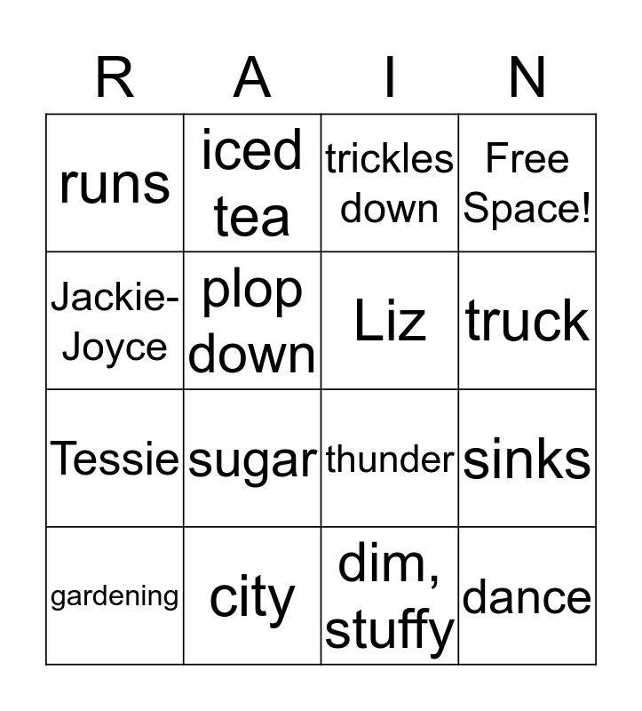This bingo card has a free space and 15 words: gardening, dance, trickles down, runs, truck, Jackie- Joyce, sugar, dim, stuffy, plop down, Tessie, sinks, Free Space!, Liz, iced tea and city.