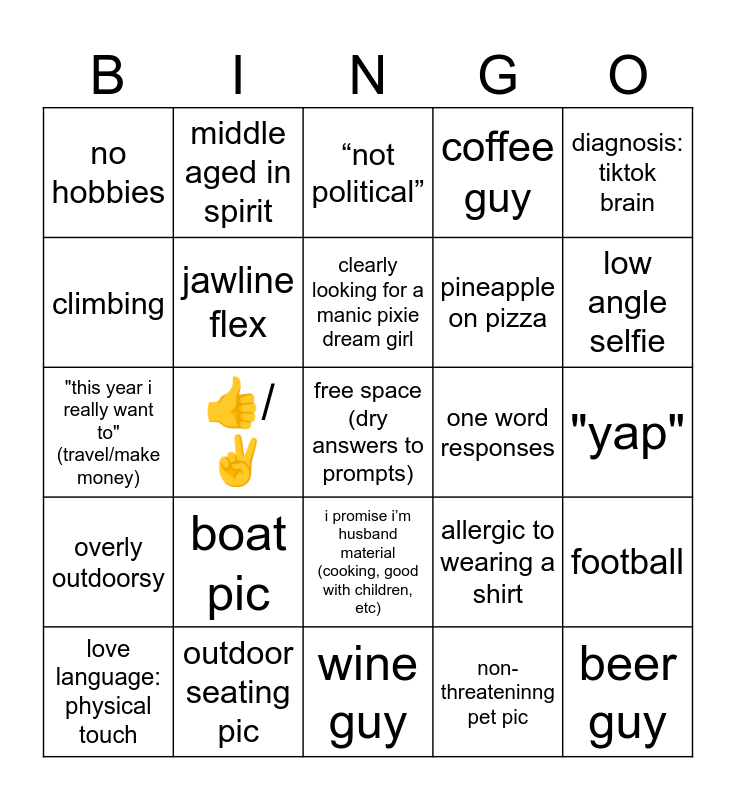 This bingo card has a free space and 34 words: beverage personality, non-threateninng pet pic, gym mirror selfie, travel as a personality trait (it isn't), overly outdoorsy, jawline flex, diagnosis: tiktok brain, love language: physical touch, middle aged in spirit, flexing (for other men) ex. cars, watches, etc., clearly looking for a manic pixie dream girl, “not political”, sunny vacation pic, knows one angle, one word responses, low angle selfie, outdoor seating pic, "this year i really want to" (travel/make money), boat pic, allergic to wearing a shirt, i promise i’m husband material (cooking, good with children, etc), (prompt) you, no hobbies, "yap", wine guy, beer guy, coffee guy, skiing, pineapple on pizza, climbing, "my strongest side is (left/right)", 👍/✌️, football and f1.