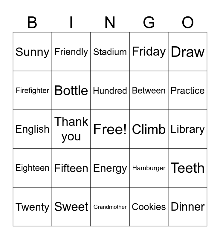 This bingo card has a free space and 150 words: Afternoon, Apple, August, Autumn, Awesome, Basketball, Bathroom, Beans, Beautiful, Beginning, Behind, Below, Between, Birthday, Bottle, Breakfast, Broccoli, Brother, Cafeteria, Camping, Careful, Celebration, Cheese, Chicken, Children, Chocolate, Classroom, Climb, Close, Cloudy, Cookies, Cough, Crown, Daily, Daughter, December, Delicious, Different, Dinner, Doctor, Dollar, Down, Draw, Dress, Drinks, Ear, Education, Eggplant, Eighteen, Eleven, Emergency, Energy, English, Eraser, Excuse, Exercise, Family, Farmer, Father, February, Felt, Fifteen, Firefighter, Football, Fourteen, Friday, Friendly, Goodbye, Grandfather, Grandmother, Hamburger, Happy, Having, Headache, Healthy, History, Hospital, Hot dog, Hundred, Important, January, Ingredient, July, Kitchen, Library, Little, March, Middle, Monday, Morning, Mother, Nationality, Next to, Night table, Nineteen, November, October, Pencil case, People, Physical, Picture, Pineapple, Playground, Practice, Refrigerator, Responsible, Restaurant, Saturday, Science, September, Sharpener, Shoulders, Sit down, Sixteen, Sleep, Slowly, Snowy, Stadium, Station, Stomachache, Straight, Summer, Sunday, Sunny, Sweet, Tasty, Teeth, Thank you, Things, Thirteen, Thursday, Tomatoes, Tomorrow, Trainers, Trousers, Tuesday, Twelve, Twenty, Vegetables, Watch, Weather, Wednesday, Welcome, Whiteboard, Window, Winter, World, Yesterday, Young and Yummy.