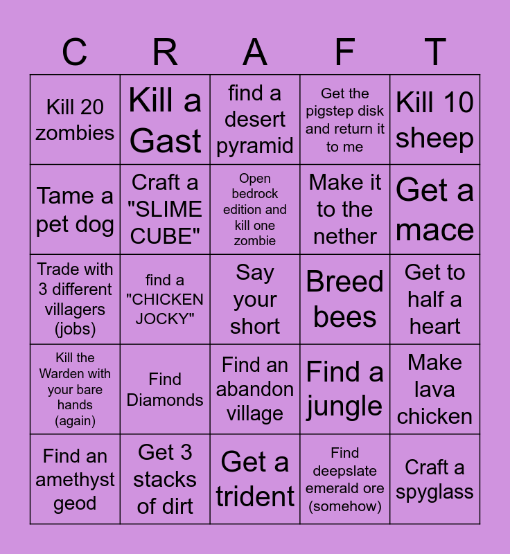 This bingo card has a free space and 24 words: Find Diamonds, Get 3 stacks of dirt, Open bedrock edition and kill one zombie, Find an amethyst geod, Kill 10 sheep, Kill 20 zombies, Tame a pet dog, Kill a Gast, Breed bees, Find an abandon village, Make it to the nether, Trade with 3 different villagers (jobs), Find a jungle, Make lava chicken, Craft a "SLIME CUBE", Find deepslate emerald ore (somehow), Get to half a heart, find a desert pyramid, Get a mace, find a "CHICKEN JOCKY", Craft a spyglass, Kill the Warden with your bare hands (again), Get the pigstep disk and return it to me and Get a trident.