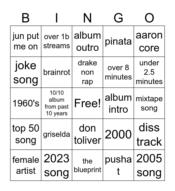 This bingo card has a free space and 24 words: griselda, 2023 song, drake non rap, female artist, aaron core, jun put me on, joke song, over 1b streams, album intro, don toliver, over 8 minutes, 1960's, 2000, diss track, brainrot, pusha t, mixtape song, album outro, under 2.5 minutes, 10/10 album from past 10 years, 2005 song, top 50 song, pinata and the blueprint.