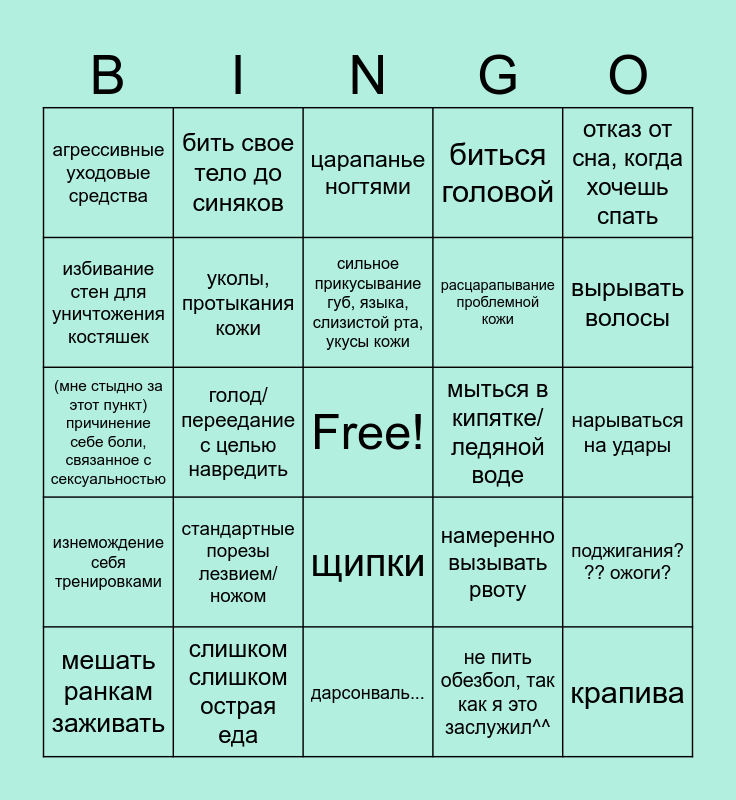 This bingo card has a free space and 24 words: стандартные порезы лезвием/ножом, слишком слишком острая еда, сильное прикусывание губ, языка, слизистой рта, укусы кожи, мешать ранкам заживать, отказ от сна, когда хочешь спать, агрессивные уходовые средства, избивание стен для уничтожения костяшек, бить свое тело до синяков, мыться в кипятке/ледяной воде, щипки, расцарапывание проблемной кожи, (мне стыдно за этот пункт) причинение себе боли, связанное с сексуальностью, намеренно вызывать рвоту, поджигания? ?? ожоги?, уколы, протыкания кожи, не пить обезбол, так как я это заслужил^^, нарываться на удары, царапанье ногтями, вырывать волосы, голод/ переедание с целью навредить, крапива, изнемождение себя тренировками, биться головой and дарсонваль....
