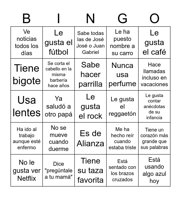 This bingo card has a free space and 24 words: No se mueve cuando duerme, Dice "pregúntale a tu mamá", Sabe hacer parrilla, No le gusta ver Netflix, Le gusta el café, Ve noticias todos los días, Tiene bigote, Le gusta el fútbol, Le gusta el reggaetón, Es de Alianza, Nunca usa perfume, Usa lentes, Me ha hecho reír cuando estaba triste, Tiene un corazón más grande que sus palabras, Se corta el cabello en la misma barbería hace años, Está sentado con los brazos cruzados, Le gusta contar anécdotas de su infancia, Sabe todas las de José José o Juan Gabriel, Hace llamadas incluso en vacaciones, Ya saludó a otro papá, Está usando algo azul hoy, Ha ido al trabajo aunque esté enfermo, Le ha puesto nombre a su carro and Tiene su taza favorita.