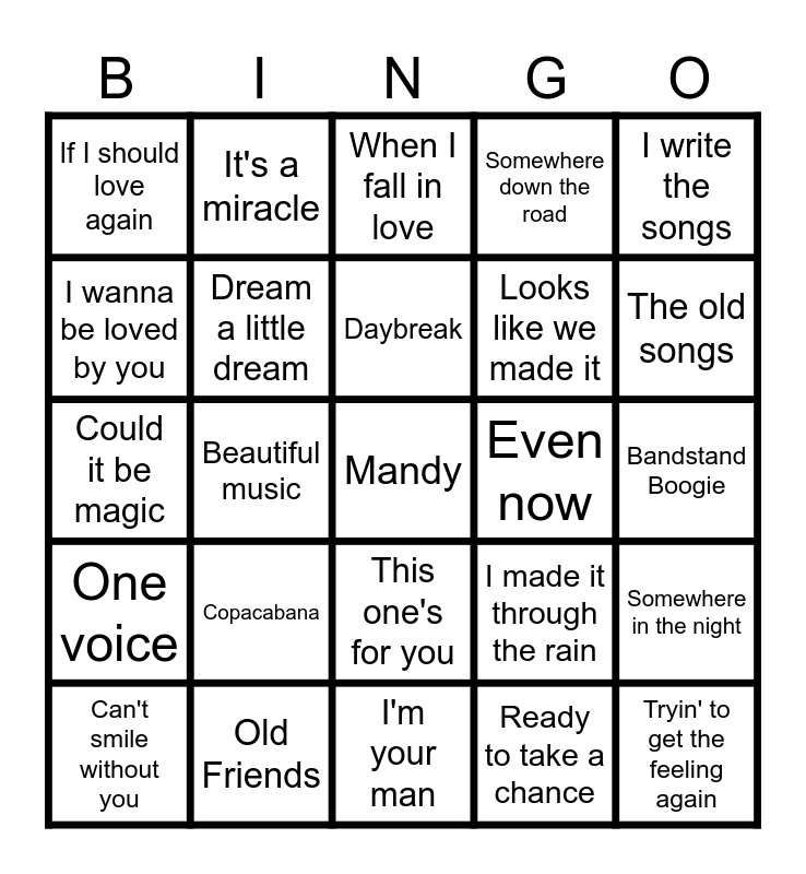 This bingo card has a free space and 24 words: Copacabana, Old Friends, Daybreak, Can't smile without you, I write the songs, If I should love again, I wanna be loved by you, It's a miracle, Even now, This one's for you, Looks like we made it, Could it be magic, I made it through the rain, Somewhere in the night, Dream a little dream, Ready to take a chance, Bandstand Boogie, When I fall in love, The old songs, Beautiful music, Tryin' to get the feeling again, One voice, Somewhere down the road and I'm your man.