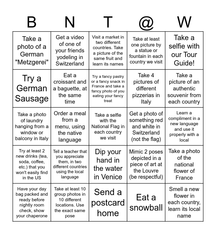 This bingo card has 25 words: Tell a teacher that you appreciate them, in two different countries using the local language, Send a postcard home, Try a fancy pastry or a fancy snack in France and take a fancy photo of you eating your fancy treat, Have your day bag packed and ready before nightly room check, show your chaperone, Take a selfie with our Tour Guide!, Take a photo of a German "Metzgerei", Try a German Sausage, Get a video of one of your friends yodeling in Switzerland, Get a photo of something red and white in Switzerland (not the flag), Dip your hand in the water in Venice, Take 4 pictures of different pizzerias in Italy, Take a photo of laundry hanging from a window or balcony in Italy, Mimic 2 poses depicted in a piece of art at the Louvre (be respectful), Take a photo of the national flower of France, Eat a croissant and a baguette, at the same time, Smell a new flower in each country, learn its local name, Learn a compliment in a new language and use it properly with a local, Visit a market in two different countries. Take a picture of the same fruit and learn its names, Take a picture of an authentic souvenir from each country, Order a meal from a menu, using the native language, Take a selfie with the National Flag in each country we visit, Take at least 10 group photos in 10 different locations. Use the exact same pose, Try at least 2 new drinks (tea, soda, coffee, etc.) that you won't easily find in the US, Take at least one picture by a statue or fountain in each country we visit and Eat a snowball.