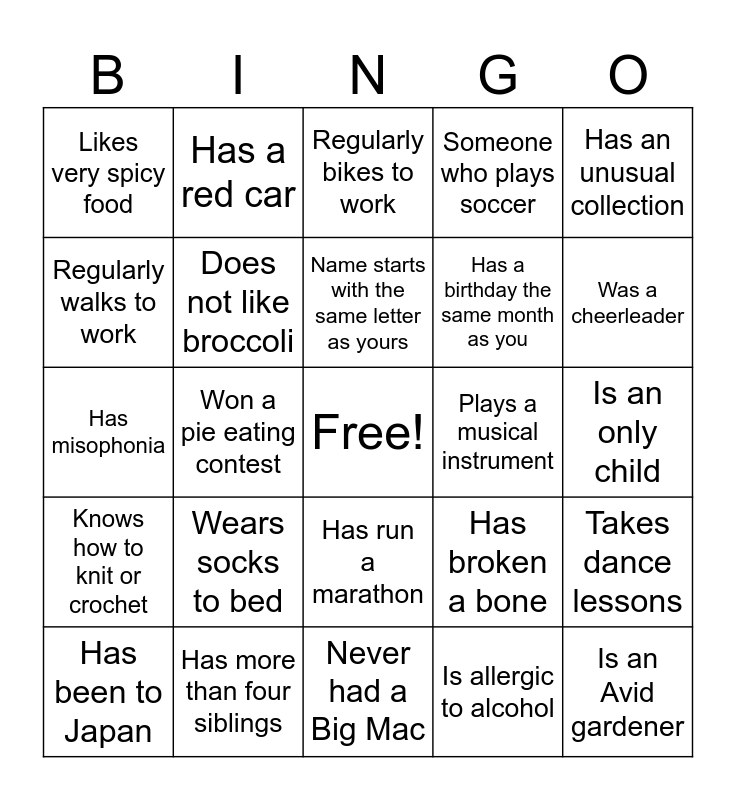 This bingo card has a free space and 29 words: Has been to Japan, Is an avid bird watcher, Won a pie eating contest, Hasn't had breakfast today, Likes very spicy food, Regularly bikes to work, Does not like broccoli, Wears socks to bed, Plays a musical instrument, Has more than four siblings, Is an only child, Is an Avid gardener, Never had a Big Mac, Is allergic to alcohol, Was a cheerleader, Has travelled to more than 3 countries, Has run a marathon, Knows how to knit or crochet, Has an unusual collection, Has misophonia, Has broken a bone, Is left-handed, Has a birthday the same month as you, Regularly walks to work, Someone who plays soccer, Has a red car, Takes dance lessons, Name starts with the same letter as yours and Has read more than 5 books this year.